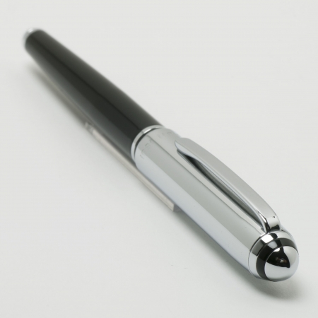 The Miles roller pen from Cerruti featuring a classical and refined shape is shiny black lacquered on its body and shiny chrome plated on its cap.