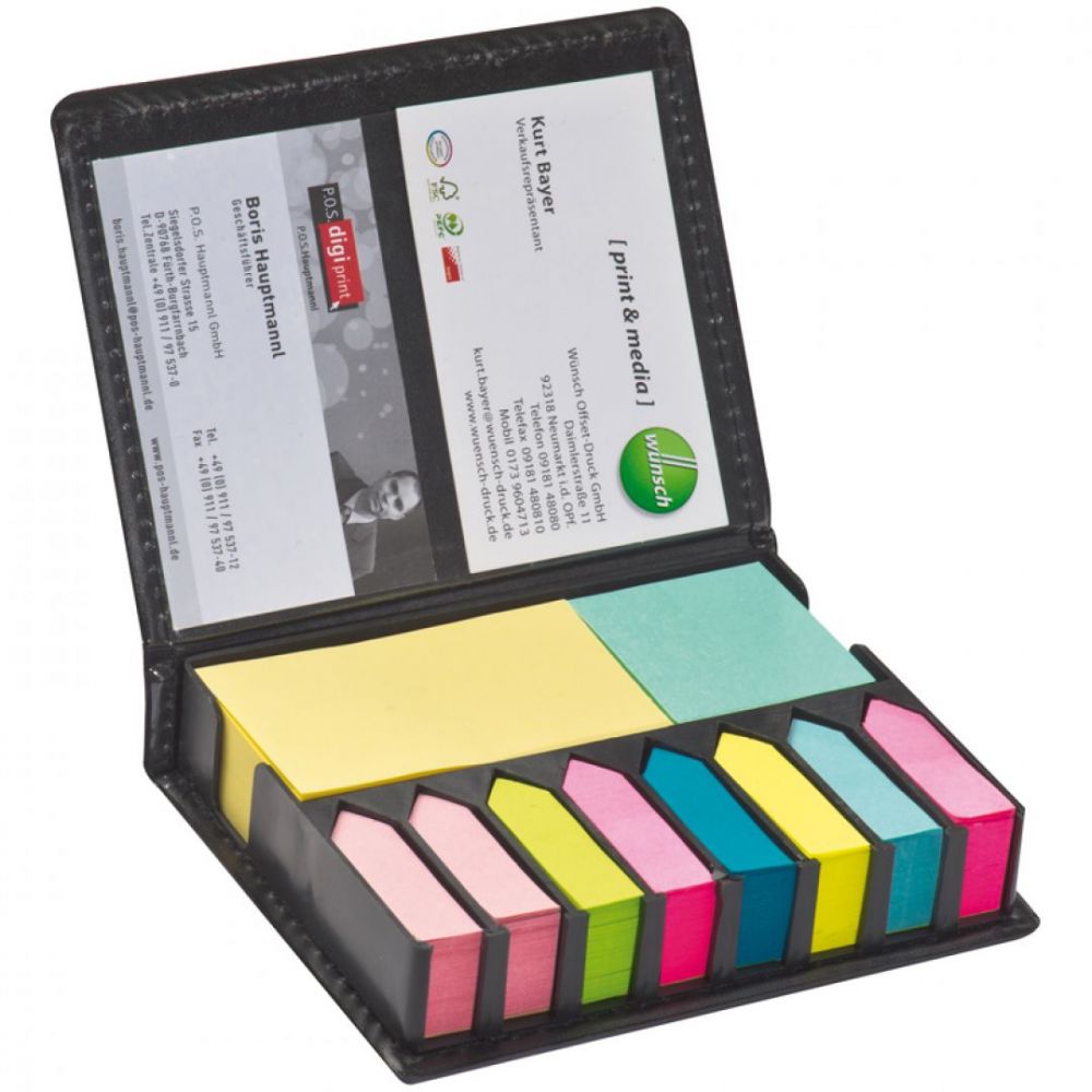 Sada samolepiacich poznámkových blokov. Ideálny držiak na písací stôl s 200 listovým modrým a žltým poznámkovým blokom a 200 samolepiacich poznámkových pásikov v 8 rôznych farbách.Vo vnútornej strane obalu je ďalší priestor napr. pre vizitky. Spôsob potlače tampónová potlač.
