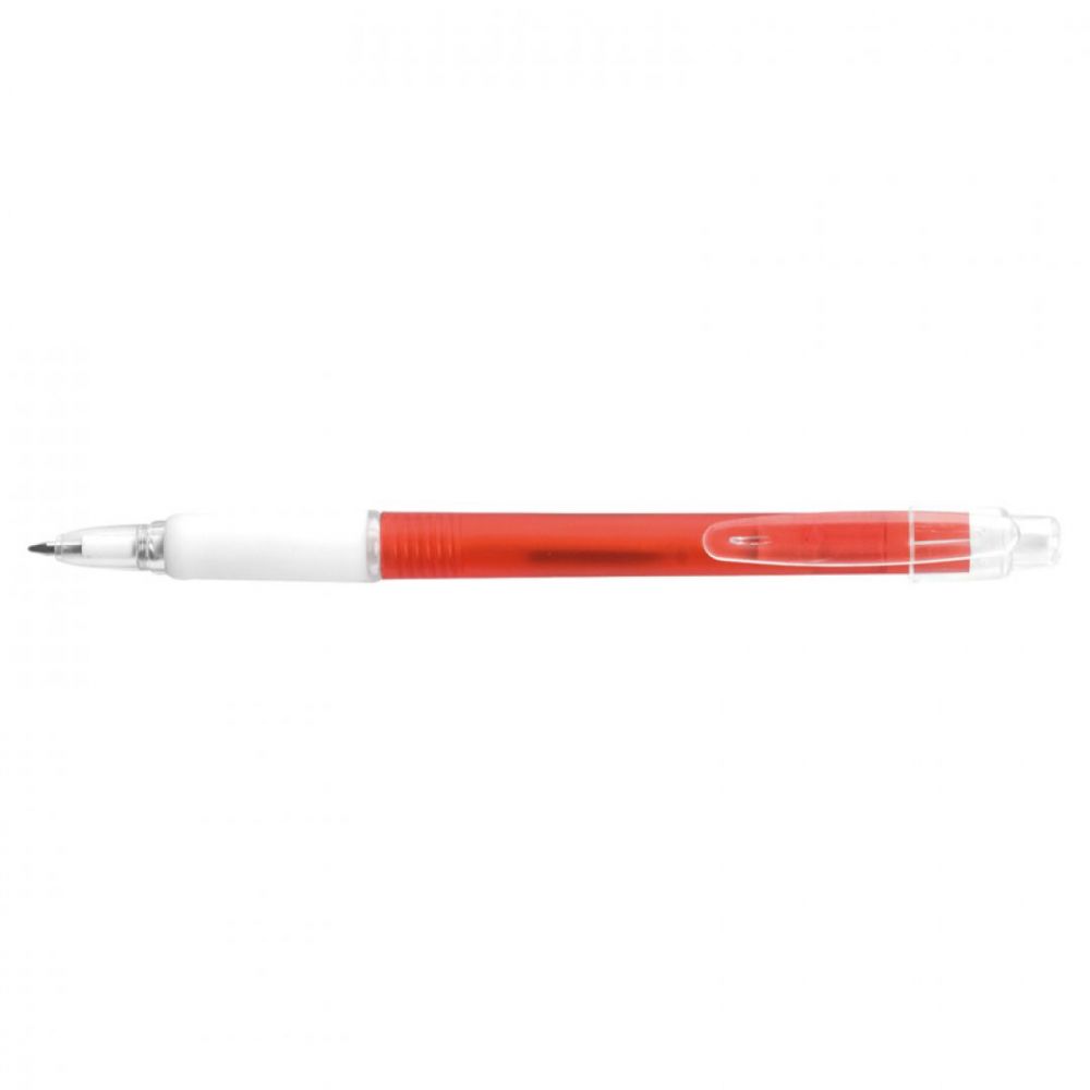 Matné plastové guľôčkové pero s gumeným úchopom a transparentnými doplnkami. Spôsob potlače tampónová potlač.